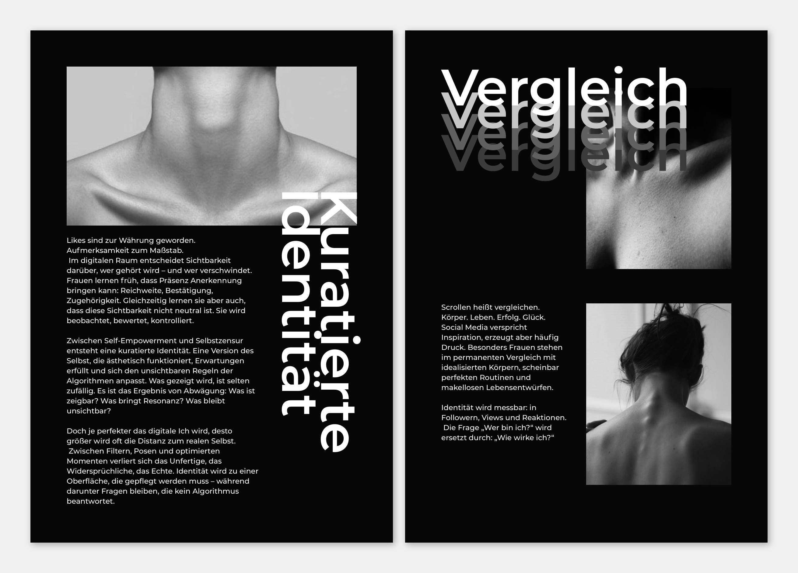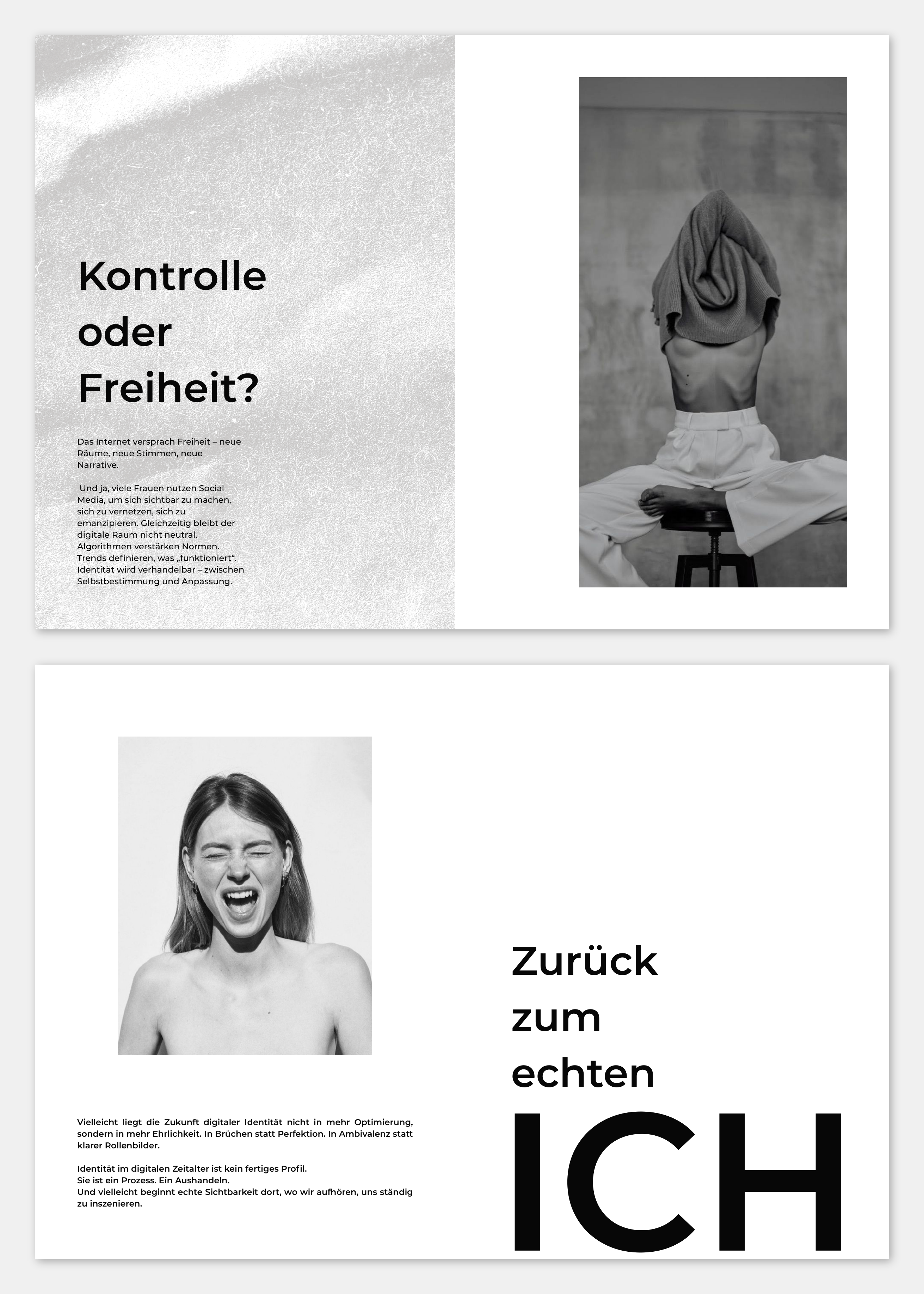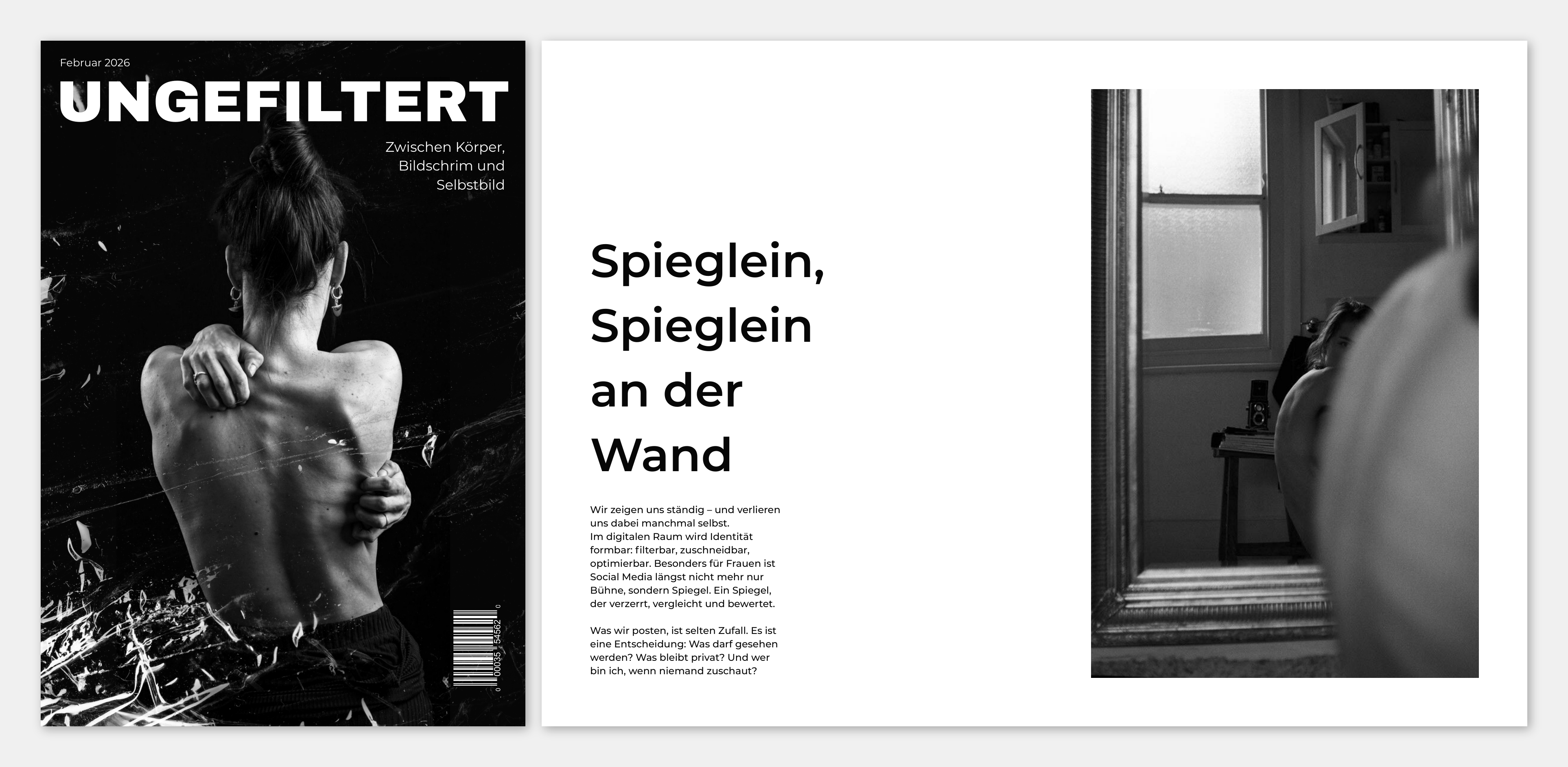 Durch reduzierte Schwarz-Weiß-Fotografie, fragmentierte Typografie und viel Weißraum visualisiert das Magazin die Distanz zwischen kuratiertem Online-Ich und realer Selbstwahrnehmung. Bild und Text arbeiten zusammen, um Kontrolle, Vergleich und Unsicherheit im digitalen Raum sichtbar zu machen.